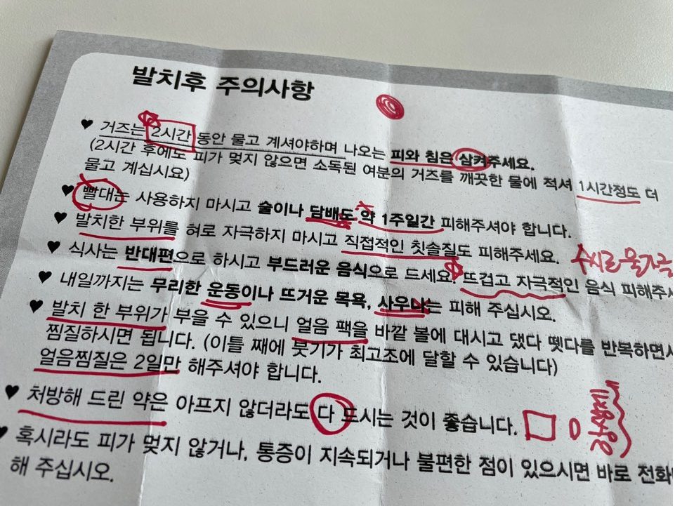 암튼 두 개 모두 발치 완료하고, 사랑니 발치후 주의사항을 들으며, 3일치 약을 타서 집으로 왔다.