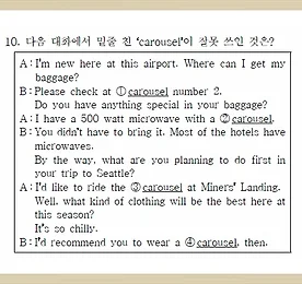 Carousel 썸네일형 리스트형 공무원 기출영어단어 carousel 캐러셀 의미 정리 2015년 서울시 9급공무원 영어 기출문제 A형, 10번에 나온carousel 캐러셀의 다양한 의미. 이적이 피쳐링을 한 리쌍의 노래에도 이게 있어서가사를 훑어봐도 도무지 힌트를 찾을 수 없어서그냥 바로 사전 검색을 했다. 간단하게 생각해서 '빙빙 돌아가는 것'을 의미한다고 보면 된다. 위 대화는 A가 I'm new here at this airport. 라고 말하는 첫문장에서 공항에서 나누고 있는 대화라는 것을 알 수 있다.자신의 짐을 어디서 찾는지 물어보자 B가 이렇게 대답한다. 1. Please check at carousel number 2.여기서 carousel은 수하물 컨베이어 벨트를 의미한다. 덧붙여 가방 속에 특별한 물건이 있냐고 묻자, A가 이렇게 대답한다. 2. I have a 500 .. 더보기 이전 1 다음